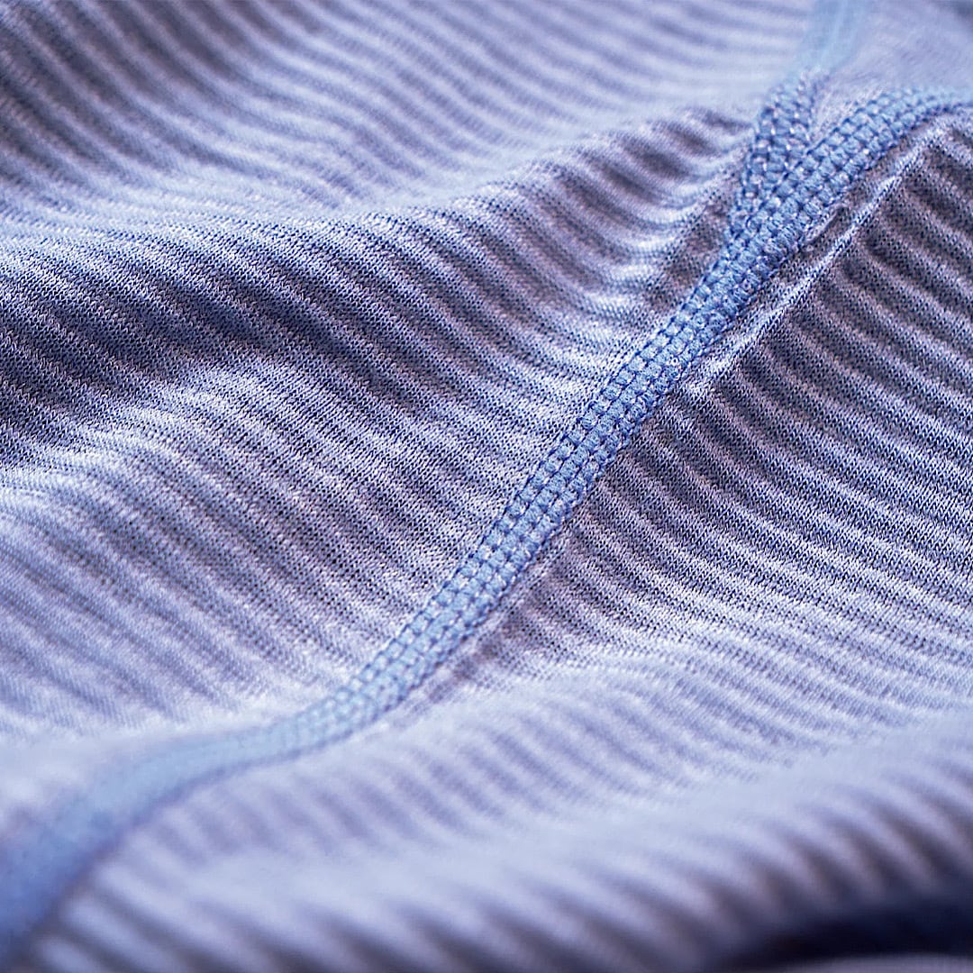 凹凸のあるボーダーメッシュ構造により高い通気性とリサイクルポリエステル糸で速乾性を高めます。 ウインドシェルを羽織ればさらに保温性が高まるため、インナーとしてもそれ単体でも活躍するアイテムです。
