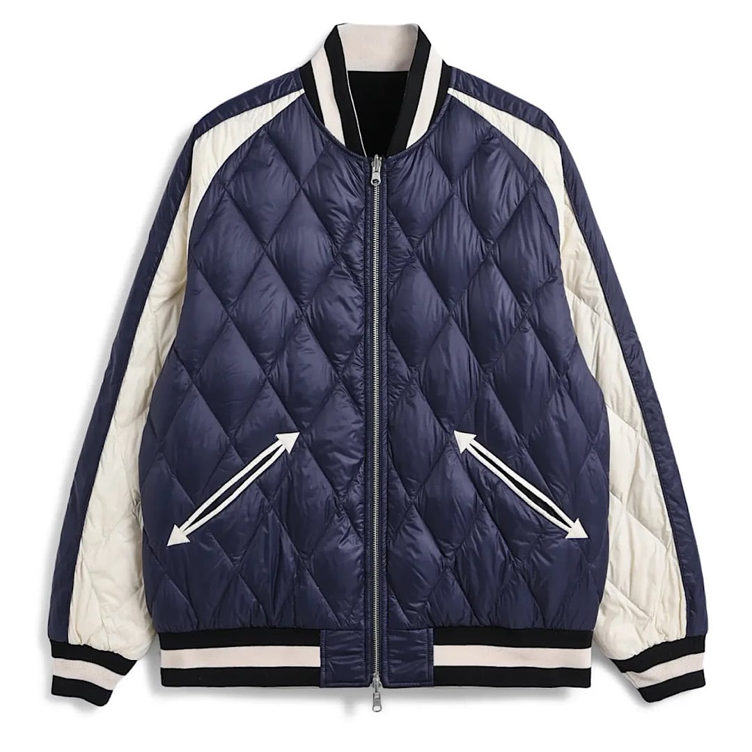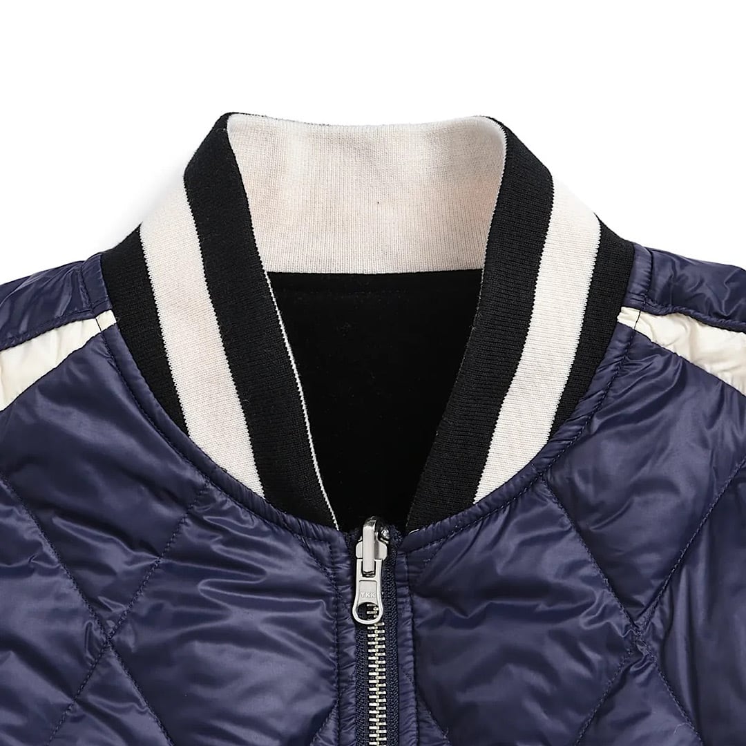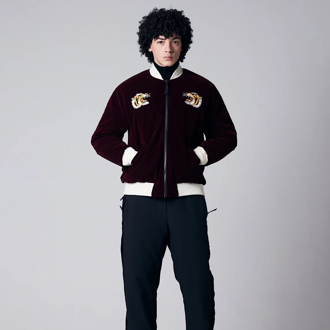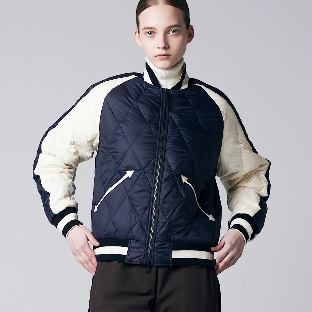 スカジャンとダウンを組み合わせた、スカジャン風リバーシブルダウンジャケット。