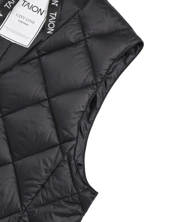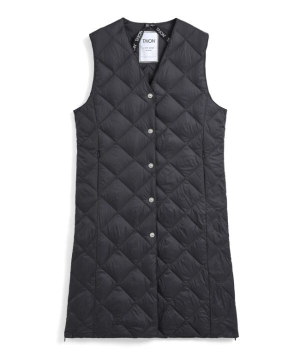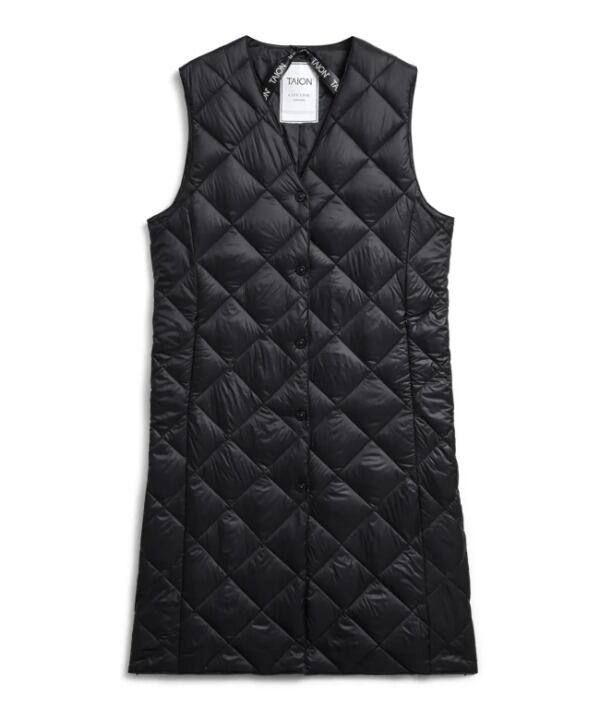 ダイヤキルトが上品な印象、レイヤードも楽しめるロング丈のVネックダウンベスト。