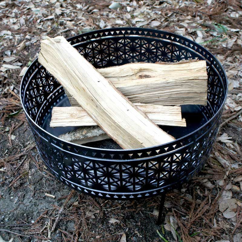 火入れした時の炎の美しさ、揺らめく光により浮かび上がる柄の美しさにこだわり造り上げた焚き火台です。