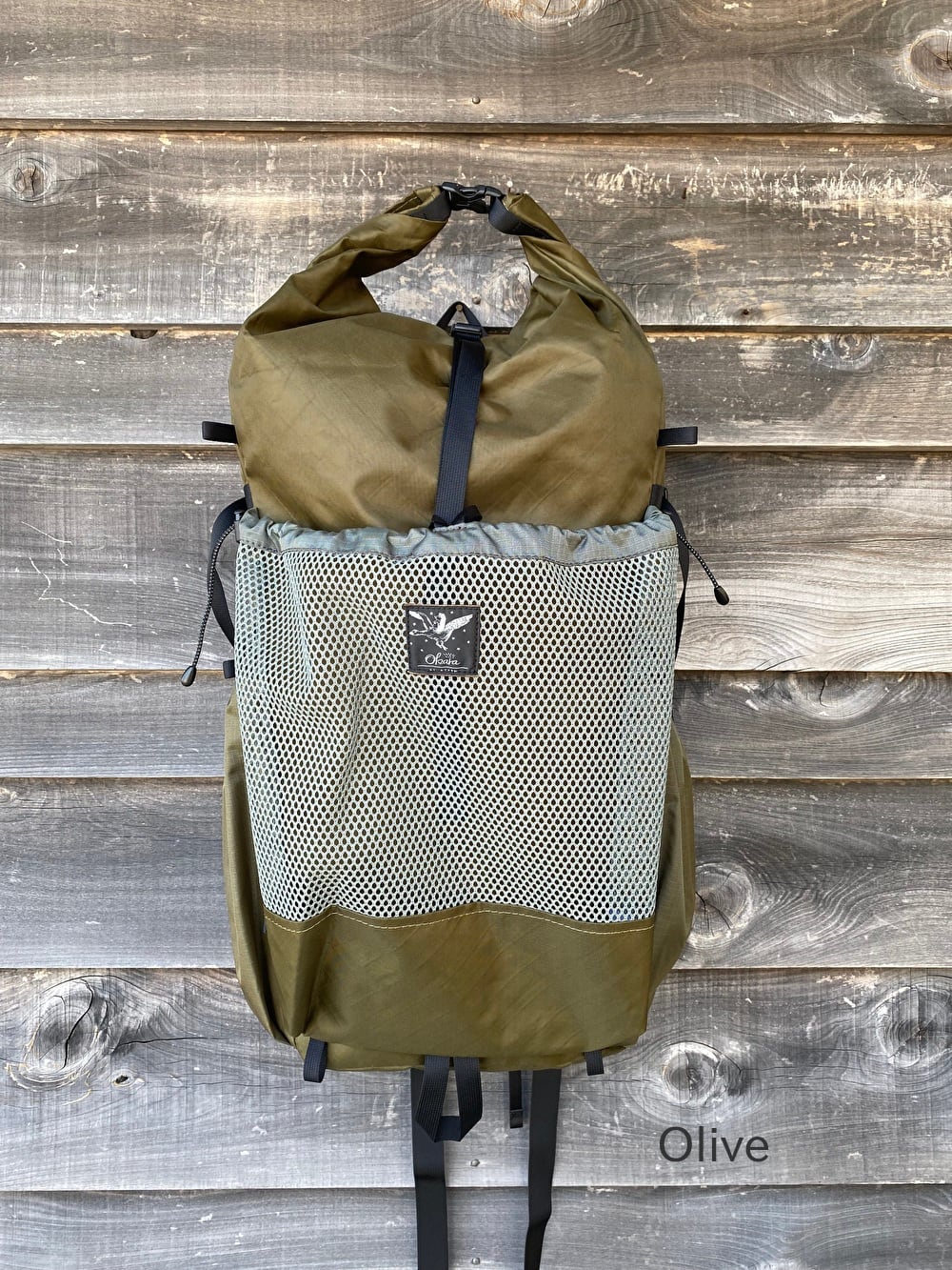 メインファブリックには防水性や耐久性に優れる米国 Challenge Sailcloth 社の ECOPAK3-EPX200(200 デニール)を採用フロントポケットにはメッシュ素材、サイドポケットには強度を重視した 210D のナイロンを使用しました。各所にたっぷりとタックを取る事で Okara らしい丸みを帯びた優しいシルエットになっています。